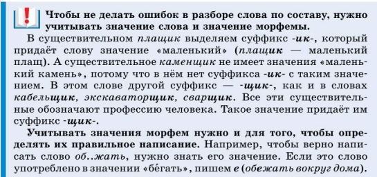 Автор объясняет, что для правильного разбора слов по составу (морфемного анализа) нужно учитывать не только их форму, но и значение морфем. Без этого можно допустить ошибки в выделении приставок, суффиксов или корней. - Примеры с суффиксами