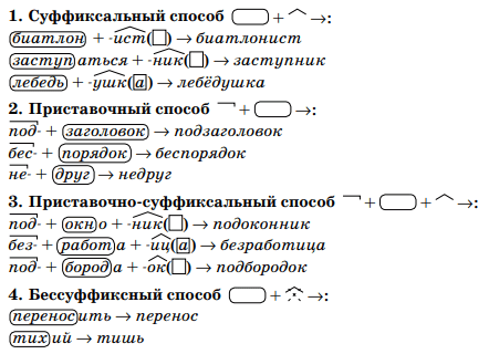 - Запишите названия перечисленных выше способов образования имён существительных и проиллюстрируйте каждый из них двумя примерами. Графически покажите, как образованы слова.
