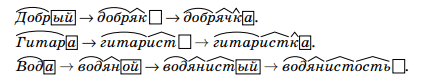 Например, в цепочке Добрый → добряк → добрячка: слово добряк образовано от слова добрый с помощью суффикса -як-; слово добрячка образовано от слова добряк с помощью суффикса -к-. Мы видим пошаговое образование, где каждое новое слово «цепляется» за предыдущее с помощью одной морфемы. Точно так же в цепочке Гитара → гитарист → гитаристка: гитарист от гитара с суффиксом -ист-, гитаристка от гитарист с суффиксом -к-.