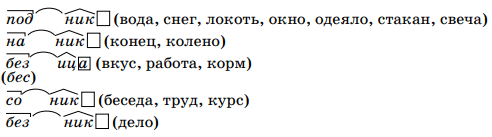 Рассмотрим следующую группу. Слово наконечник образовано от слова конец. К корню -конеч- добавились приставка на- и суффикс -ник-, окончание нулевое □. Слово наколенник образовано от слова колено. Оно состоит из приставки на-, корня -колен-, суффикса -ник- и нулевого окончания □.