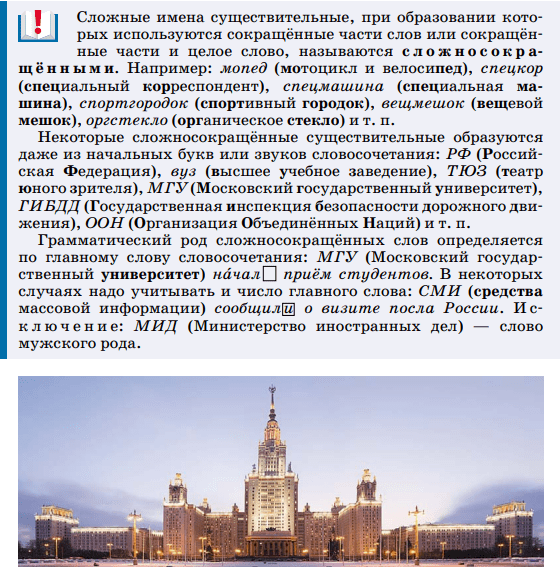 Многие сложные имена существительные образуются из сокращённых частей слов и называются сложносокращёнными: юннат (юный натуралист), спецкор (специальный корреспондент) и т. п. Некоторые сложносокращённые существительные образуются даже из начальных букв или звуков словосочетания: РФ (Российская Федерация), вуз (высшее учебное заведение) и т. п.