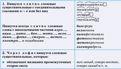 Правила правописания сложных имён существительных, представленные в тексте, включают как известные, так и, возможно, новые для вас. Вероятно, правила написания сложных существительных с соединительными гласными о-е и без них, а также правила написания названий промежуточных сторон света и существительных, состоящих из самостоятельных слов, могли быть изучены ранее. Новыми могут являться правила слитного написания сложных слов с иноязычными частями, дефисного написания географических названий и правописания существительных с первой частью пол-/полу-.