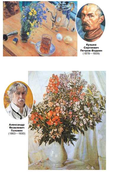 Внимательно рассмотрите репродукции картин К. С. Петрова-Водкина «Утренний натюрморт» (1918) и А. Я. Головина «Натюрморт. Цветы в вазе» (1910). Назовите предметы, изображённые художниками. Укажите признаки этих предметов. Как расположены предметы? Что находится в центре внимания? Что привлекает вас в каждой картине? Ради чего они созданы художниками? Напишите сочинение по одной из картин. Каким стилем речи вы воспользуетесь? Какую основную мысль будете выражать?