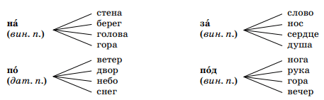 На́ стену, на́ берег, на́ голову, на́ гору. По́ ветру, по́ двору, по́ небу, по́ снегу. За́ слово, за́ нос, за́ сердце, за́ душу. По́д ногу, по́д руку, по́д гору, по́д вечер.