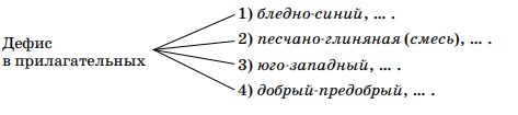 Также дефис ставится, если сложное прилагательное может быть заменено равноправными словами с союзом «и». Примерами из схемы являются песчано-глиняная (песчаная и глиняная), русско-английский (русский и английский), шахматно-шашечный (шахматный и шашечный), поисково-спасательная (поисковая и спасательная). Дополнительные примеры: плодово-ягодный (плодовый и ягодный), научно-технический (научный и технический), англо-русский (английский и русский).