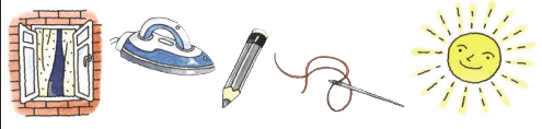 1) Конь стальной, хвост льняной. (Игла с ниткой) 2) Чёрный Ивашка, деревянная (искл.) рубашка*, где носом ведёт, там заметку кладёт. (Карандаш) 3) Поля стеклянные (искл.), межи деревянные (искл.). (Окно) 4) Катится золотое яблочко по серебряному блюдечку.* (Солнце) 5) По полотняной стране пароход* плывёт, за ним такая гладь*, что и зыби не видать. (Утюг)