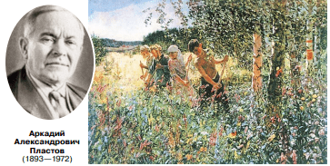 - Внимательно рассмотрите репродукцию картины А. А. Пластова «Сенокос» (1945). Почему это произведение создаёт настроение ликующей радости? Какими красками пользуется художник, чтобы изобразить пёстрый ковёр цветущего луга, пронизанные солнечными лучами деревья?