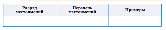 Используя материалы § 42—46, заполните таблицу и на её основе подготовьте сообщение на тему «Разряды местоимений». Составьте по два предложения с местоимениями каждого разряда и запишите их в третью графу таблицы.