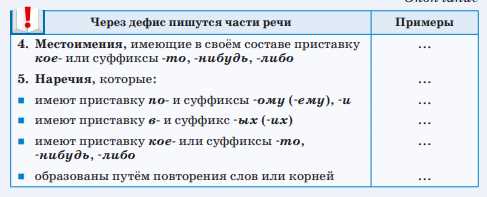 | Местоимения | кто-то, что-нибудь, что-либо | Обозначают неопределенные объекты или лица. Дефис используется для соединения приставки или суффикса с основным словом. |