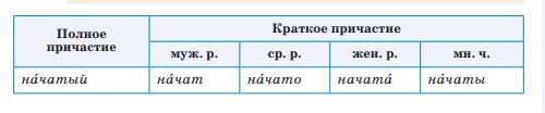 Полное причастие муж. р. начатый, запертый, поднятый, принятый, проданный ср. р. начато, заперто, поднято, принято, продано жен. р. начата, заперта, поднята, принята, продана мн. ч. начаты, заперты, подняты, приняты, проданы