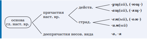 - Используя данную схему, расскажите, какие формы причастий и деепричастий образуются от основы глагола настоящего времени.