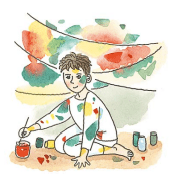 Коля составил банки с красками на пол, залез под палантин и стал решительно красить снизу туго натянутую шёлковую материю. … Папа с мамой не сразу узнали, кто сидит под столом. Тот, кого они вытащили, походил на павлина — такими колерами отливали его физиономия и ночная рубашонка, сплошь перепачканные красками. На лбу смешались фиолетовая, красная, белая краски. Щеки были желтыми, губы — сине-зеленые. Правое ухо было оранжевым с коричневыми полосками, левое — серым. Руки маленького художника переливались всеми цветами радуги. «Точно павлин», — смеются родители.