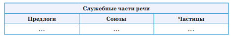 - Выпишите из текста предыдущего упражнения слова служебных частей речи, распределяя их по графам таблицы.