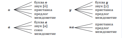 У: буква у (кукуруза); звук [у] (кабл[у́]к); приставка (усидеть); предлог (стоять у стены); междометие (У, как больно!).