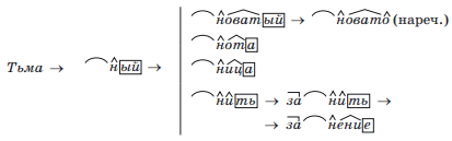 Следующая ветвь словообразования начинается с глагола темнить. Этот глагол образован от основы прилагательного тёмный (или непосредственно от корня тем-) с помощью суффикса -и- и инфинитивного окончания -ть. Глагол темнить может означать как «делать что-либо тёмным», так и, в переносном смысле, «скрывать что-либо, недоговаривать, быть неискренним», что отражено в примере не надо темнить. От глагола темнить образуется глагол затемнить при помощи префикса за-. Этот префикс в данном случае указывает на завершение действия или его направленность на объект, делая его тёмным. Например, затемнить снимок означает сделать его менее ярким или более тёмным. Наконец, от глагола затемнить образуется существительное затемнение с помощью суффикса -ениj- (в данном случае -ени-) и окончания -е. Это существительное обозначает как процесс действия по затемнению, так и его результат, то есть состояние или область, которая стала тёмной, как в примере легкое затемнение, указывающем на незначительное уменьшение освещенности. Таким образом, все эти слова, несмотря на различия в частях речи и оттенках значений, объединены общим корнем тем-, который является носителем основного лексического значения, связанного с темнотой или отсутствием света.