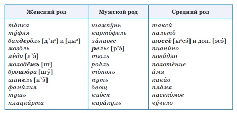 - Существительные, оканчивающиеся на мягкий знак (ь), так как среди них есть как существительные женского рода (например, мозоль, молодёжь, шинель, тушь, бандероль), так и мужского рода (например, шампунь, картофель, рельс, тюль, рояль, тополь, путь, каракуль). Для таких слов необходимо запоминать их род или проверять по словарю, поскольку нет универсального правила, применимого ко всем словам на -ь. Например, чистый тюль (мужской род), но больная мозоль (женский род).
