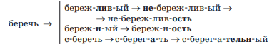В данной группе однокоренных слов представлены три словообразовательные цепочки, исходящие от исходного слова беречь.