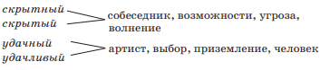 Словосочетания с прилагательными от корня «скрыт-«: Скрытный собеседник, скрытые возможности, скрытая угроза, скрытое волнение.