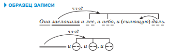- «Крупные лепестки выведены рельефно и ажурно.» В этом предложении однородными являются обстоятельства образа действия рельефно и ажурно, соединенные союзом и. Схема: [— = О и О], где — обозначает подлежащее, = – сказуемое, а О – однородные обстоятельства.