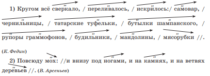 Второе предложение, «Всё кругом выглядело несказанно радостным / и привлекательным: // зелёная трава на улице, / шумящая листва на деревьях, / солнце над / / головой. // (А. Мусатов)», также богато интонационными пометами. После слова «радостным» стоит одинарная косая черта (/). Она указывает на короткую паузу, разделяющую два однородных сказуемых – «радостным» и «привлекательным». Тон голоса здесь может быть слегка восходящим или ровным, подчеркивая связь между этими двумя определениями. Двоеточие после слова «привлекательным» снова предвещает перечисление. Над словом «привлекательным» изображена стрелка, направленная вверх, что означает повышение тона голоса на этом слове. Это повышение тона создает эффект предвкушения, указывая на то, что сейчас будет подробно описано, что именно выглядело радостным и привлекательным. Сразу после двоеточия, перед «зелёная трава», стоит двойная косая черта (//). Это длительная пауза, которая служит для четкого отделения обобщающего слова от последующего ряда однородных членов. Эта пауза позволяет слушателю подготовиться к восприятию деталей. Далее, после «улице» и после «деревьях», мы видим одинарные косые черты (/). Эти пометы обозначают короткие паузы, которые используются для разделения каждого элемента в ряду однородных членов. При произнесении каждого такого элемента тон голоса обычно остается ровным или слегка повышается, указывая на то, что перечисление продолжается. После слова «над» также стоит одинарная косая черта (/), что может указывать на очень короткую, почти незаметную паузу или легкое интонационное разделение внутри последнего элемента перечисления. И наконец, после слова «головой» и в самом конце предложения, снова стоят двойные косые черты (//). Это указывает на финальную, длительную паузу, которая сигнализирует о полном завершении предложения. Стрелка, направленная вниз, над словом «головой», подтверждает понижение тона голоса, что характерно для конца повествовательного предложения, завершающего мысль. Таким образом, интонация во втором предложении ведет слушателя от общего утверждения через ожидание к детальному перечислению с небольшими остановками и окончательному завершению. Эти интонационные пометы являются ключевыми для правильного и выразительного чтения, позволяя передать не только смысл, но и эмоциональный подтекст текста.