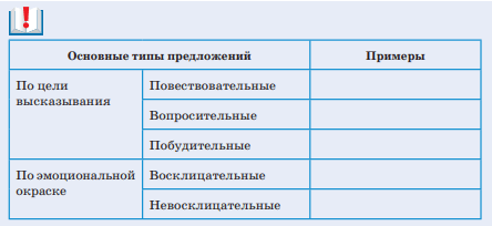 - Используя материалы подготовленной вами таблицы, расскажите об основных типах предложений.