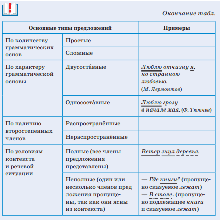По характеру грамматической основы предложения подразделяются на: двусоставные, которые имеют в составе подлежащее и сказуемое, например, «Люблю отчизну я, но странною любовью»; и односоставные, которые имеют в составе только один главный член, как в примере «Люблю грозу в начале мая».