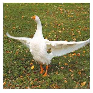 Описывая поведение гуся, автор отмечает, что он ходил важно, обдумывая каждый шаг. Перед тем, как переставить лапу, он поднимал её к белоснежному кителю, собирал перепонки, подобно тому как складывают веер, и неторопливо опускал лапу в грязь. Таким образом, он ухитрялся проходить по самой хлюпкой, растележенной дороге, не замарав ни единого пёрышка.