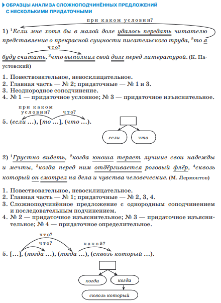 Внимательно изучите план синтаксического анализа сложного предложения (см. справочные материалы учебника) и данные ниже образцы анализа сложноподчинённых предложений с несколькими придаточными. Спишите образцы, давая необходимые комментарии к синтаксическому анализу.
